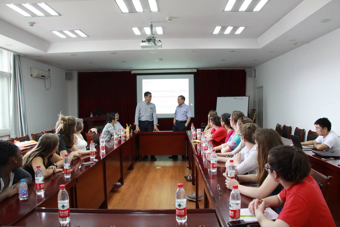 陆克定研究员、北京市规划设计研究院甘霖规划师等参加了交流活动。双方就北京雾霾与治理、北京的城市规划等问题进行了深入交流,达成了广泛共识。 交流活动由冯长春教授主持,首先向辛辛那提大学地理学一行致欢迎词。陆克定研究员作了题为“Haze and harnessing in Beijing”的学术报告:首先介绍了关于雾霾的几个基本概念,并描述了北京的雾霾特征,阐释了雾霾产生的主要三大原因:高排放、不理想的地形地貌以及氧化作用,最后提出了解决雾霾问题的几点建议;北京及其周边的雾霾形成机理十分复杂,是扩展该领域全球视角的理想案例。 图2 陆克定研究员介绍北京雾霾及治理 甘霖规划师作了题为“Beijing2035 and Beijing2018: A desired future and the path to it”的学术报告:首先介绍了北京城市历史、规模、人口等基本情况,以及北京城市总体规划的历程,并对最新版的北京城市总体规划的最新特点、城市定位、发展目标、空间结构等方面进行了详细阐述。 图3 甘霖规划师介绍北京城市总体规划 会后,3p视频