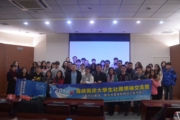 党委副书记叶静漪和财团法人十大杰出青年基金会执行长赖国洲先生相继致辞并互赠礼品;两岸学生代表赵倩和陈琬沂也分别就此次活动主题发言,显示出两岸杰出青年间的友谊。 图一 营员在黑豹野生动物保护基地 11月23日营员们来到了天津。两岸的朋友们在参访中国海洋石油环保服务有限公司过程中了解了溢油的应急和环保处理;在南开大学泰达校区听取了孙红文教授的报告,并与南开大学的社团领袖们交流、学习;在沈阳,营员们与来自沈阳二中、东北育才中学、沈阳实验中学三所3p视频的学弟学妹交流分享了环保经验。沈阳之旅精彩纷呈:参观了沈阳故宫和少帅府,欣赏了当地民间艺术东北二人转。两岸学生在感受沈阳独特文化的过程中促进了彼此的交流,加深了两岸友谊。 图二 参访中国海洋石油环保服务有限公司 图三 营员于少帅府合影 交流营最后一站是享有中国花园城市之称的大连,营员们在这里参观了圣亚海洋世界,了解了极地动物的生活,观赏了白鲸和海象的表演。随后营员们来到大连理工大学参加了杨凤林教授的讲座与该校的社团交流,收获颇丰。 图四 大连理工大学交流活动 25日晚,环渤海交流营成果分享会在大连举行,3p视频