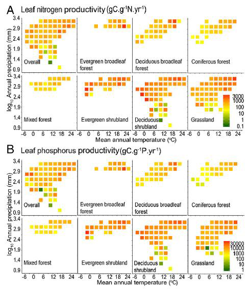 唐志尧副教授课题组与中科院植物所谢宗强研究员共同组织了碳专项灌丛课题的相关工作。在此PNAS专题中,唐志尧与中科院植物所、华南植物园等单位合作,揭示了中国陆地生态系统生产力的的化学计量机制。 植被生产是生态系统固碳的主要途径,叶片是植被生产的主要器官。局域尺度的个体的研究表明,植被生产力受制于叶片氮、磷含量。然而以往研究仅在个体水平开展,缺乏区域尺度植被生产力与植物化学计量之间关系的研究;然而由于生态系统中不同物种的个体数量悬殊,植物主要器官的氮、磷功能差异显著,因此基于个体的叶片养分与生产力的关系难以推演到生态系统。 图1 中国主要陆地生态系统氮、磷利用效率随年均温和年降水的变化 本研究中,唐志尧课题组与合作通过大量的野外调查取样,获取了4,159个样地中常见物种不同器官(根、茎、叶)的碳、氮、磷含量以及生物量,首次通过生物量加权研究了群落层次植物不同器官碳、氮、磷化学计量的大尺度格局及其与生态系统初级生产力的关系。研究发现:在国家尺度,不同植物器官之间的植物养分含量符合幂函数关系,叶片养分含量比根、茎养分含量更稳定;生态系统总初级生产力与叶片氮磷储量均成正相关关系,但在不同生态系统类型中,总初级生产力与叶片氮磷储量之间的关系取决于养分在不同器官之间的分配策略及优势植物的叶寿命。他们进而计算了中国陆地生态系统的植物叶片平均氮、磷生产效率(即单位质量的叶片氮或磷所生产的总初级生产力)分别为250 gC GPP/gN.yr-1 和 3,158 gC GPP/gP.yr-1,该生产效率随温度和降水的增加而增加;未来气候变暖背景下,生态系统可能会通过提高其氮、磷效率来增加总初级生产力。这一研究将植物养分的大尺度化学计量研究由个体以及单个器官扩展到群落层次,为进一步估算植物养分储量及模拟生态系统生产力对氮、磷沉降的响应提供了科学依据。 论文“Patterns of plant carbon, nitrogen, and phosphorus concentration in relation to productivity in China’s terrestrial ecosystems” (//www.pnas.org/content/115/16/4033)于2018年4月17日在线发表。3p视频
