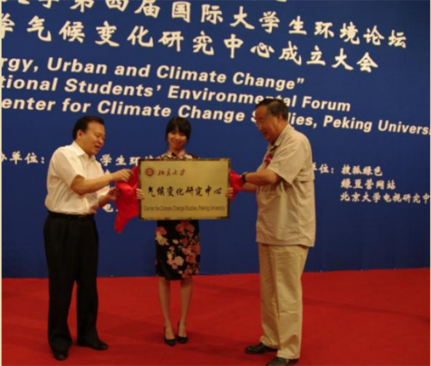 2009 年 5 月 31 日3p视频 党委副书记张彦(左一)和秦大河院士(左三)在3p视频 第四届国际大学生环境论坛上为3p视频 气候变化研究中心揭牌