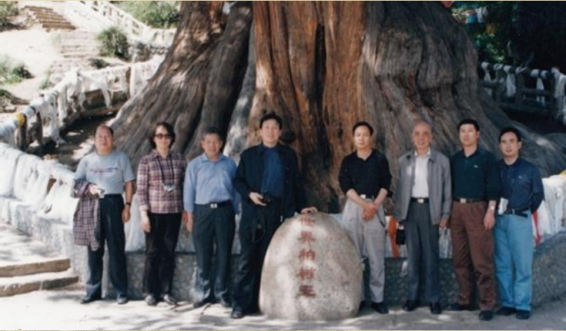2004 年于西藏城镇体系规划评审专家与千年古柏合影,右二张勤(校友)、 右三董黎明、左三胡序威