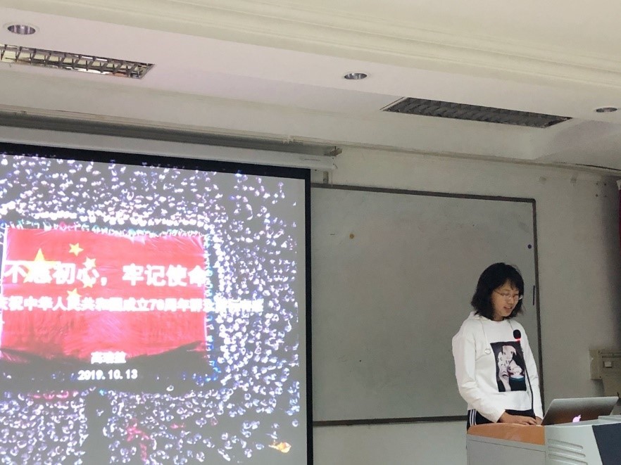本科生党支部于逸夫二楼3459举行 “不忘初心、牢记使命”主题教育活动暨秋季学期第一次党支部大会,院党委办公室主任刘萍和支部全体党员参加此次活动。活动由支部书记蔡茂主持。 首先,2016级城规班范文颖同学和2015级城规班高瑜堃同学分别向与会党员做线下学习心得交流分享。范文颖同学分享了她学习关于“不忘初心、牢记使命”重要论述的体悟——青年力量是希望之所在。她认为,新时代下,党与青年的联系更为紧密,党更好地与青年进行沟通,将爱国、爱党的信念种在青年人的心中。而我们作为北大青年,应该承担起自己的责任使命,找到自己的位置,努力奋斗。高瑜堃同学则用风趣的语言分享了她参与庆祝中华人民共和国成立70周年群众游行的感受,阐述了她自己对于“不忘初心,牢记使命”的理解:“不忘初心”,不忘的是一颗中国心,一个能让我们抛弃一切狭隘的个人利益带来的琐碎的烦恼和人之间的不同,倾心而听的理由。“牢记使命”,牢记的是让中国强起来的使命,是要在很近的将来实现中国的政治、经济、文化和科技高度自信的使命。 高瑜堃同学分享参与重大活动心得 交流分享环节之后,蔡茂传达了3p视频