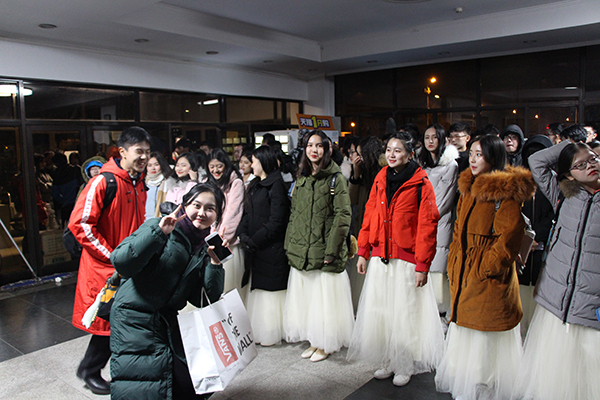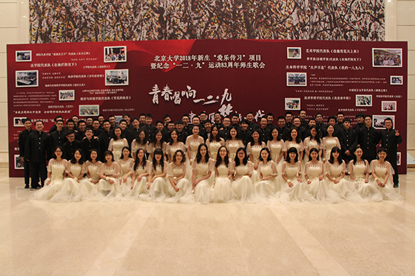 大一的同学们来说,这却是他们人生中不可多得的暖冬。每周五、周日的排练让他们的冬天充满了音乐与友情。 渐入佳境的排练 从逸夫二楼3459分声部时的五音不全、到第一次排练练声时的嬉皮笑脸,到第一次完整唱下《雪花的快乐》时的激动与满满成就感……58天不长的时间里,同学们一起经历了无数温暖又欢乐的瞬间,认识了可爱的学长学姐们,也完成了自身的蜕变。在十二月九号的夜晚,城环的同学们都信心满满。 那天早上,不少男同学兴奋得睡不着觉,早早穿上了俊(cu)朗(zhi)帅(lan)气(zao)的中山装,更是有同学早早来到逸夫二楼化妆(接受审判)。一通“涂脂抹粉”和互拍黑照后,城环的同学们又最后一遍练习唱了那熟悉的《雪花的快乐》,和第一次唱下来的有点不同,这次的《雪花的快乐》,歌词和旋律都深深印在了同学们的心里。 晚餐后,同学们一个个被上了酷刑涂了口红。突然,3459教室里响起周璇的《四季歌》,吸引了同学们注意力,大家的目光被引向前排的白幕,原来是视频组为一二九专门录制的开场视频。复古的场景陈设,同学们出神入化的表演,随着情节推进愈发激荡的配乐,让这部开场视频有了大片的既视感。 出发! 一路“百鬼夜行”从逸夫二楼到了百讲,同学们的心情又激动又紧张。嘴上相互取笑着对方的妆容,心里却始终想着上台的注意事项、“奔涌”的轮唱技巧。作为第一个上场的队伍,城环同学们深知先声夺人的重要性。在祎勍和浩舒学长的引导下,同学们在厕所门口走廊边进行了最后的练声。入场前,同学们在大厅留下了珍贵的合影(可能是自九月军训以来城环萌新们人最齐的一张合照)。 在赛场上,当轻柔的钢琴响起《雪花的快乐》的前奏,台上每一个同学的情绪都被充分地调动了。舒缓的歌声配上优雅的舞蹈,再加上打在地上的“雪花”,让每一位观众仿佛进入了徐志摩诗中的浪漫意境。鼓奏响起,灯光由柔和变得敞亮,这是城环同学们《想你的365天》带给观众们的欢乐感受。在齐声的“babala”中,同学们的快乐情绪也被推向了高潮,台上的每一个人都真正地开始享受音乐。歌声戛然而止,随之而来的又是响彻全场的“希望,希望,希望”,《雪花的快乐》为这首合唱曲做了完美的收尾。一曲终了,余音绕梁,掌声从四面八方奔涌而来。 最后,3p视频