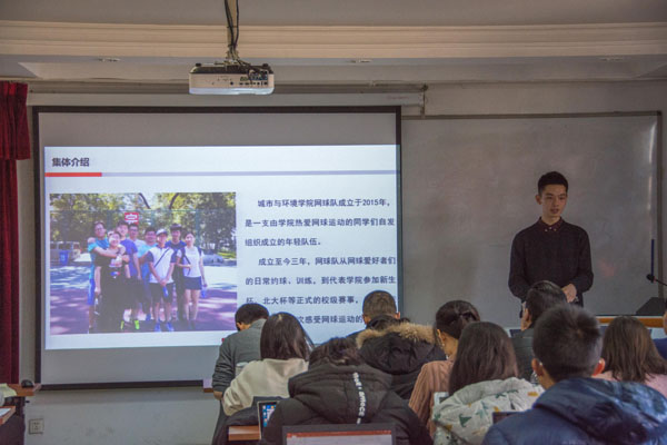 网球队答辩 图二 邓鲁川代表2015级本科城规班-团支部答辩 答辩会上,各团队展示了集体建设中的自身特色与突出成绩。2015-2018级本科生党支部介绍了党员培养与发展、理论学习与实践、社会服务与奉献等方面的党建特色工作;2015级本科环科班-团支部、2016级本科城规班-团支部、2017级本科资环班、2018级本科1班-团支部等11个班级-团支部不仅从班团成绩、班团活动、出彩人物等方面展示了队伍风采,也结合各自的专业特色展示了前往野外、企业、科研院所等地的实习活动,让大家感受到实践中的专业风采,体现出城环青年走向城镇乡野、用脚步丈量中国大地的精神;3p视频