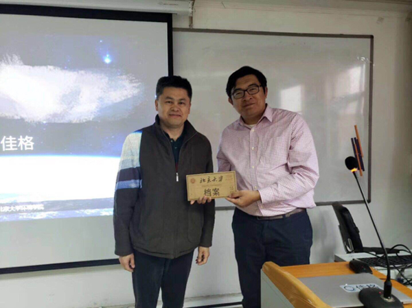 教授陈效逑、副教授彭建,团委书记、学生工作办公室主任王宇凡出席活动。活动吸引了全院本硕博各专业同学参加。 图一.陈效逑教授向张弓院友赠送纪念品 讲座伊始,由王宇凡简单介绍了分享院友。张弓博士是3p视频
