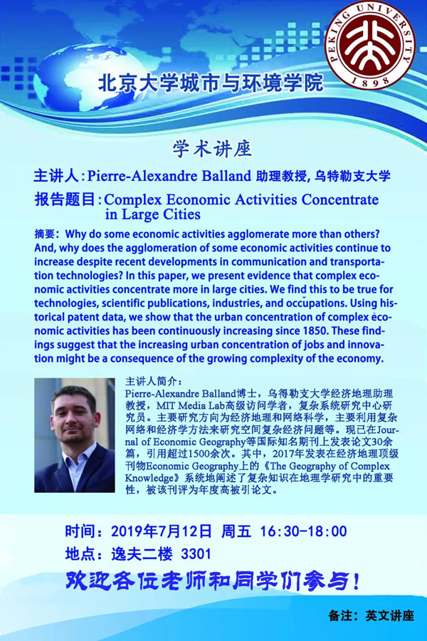 逸夫二楼分别带来题为“Complex Economic Activities Concentrate in Large Cities”及“From Public Data to Responsible A.I.”的精彩讲座。此次讲座由朱晟君研究员主持,有来自多校多院系师生参加,座无虚席,反响热烈。 讲座回顾一 主讲人:Pierre-Alexandre Balland 助理教授,乌特勒支大学 报告题目:Complex Economic Activities Concentrate in Large Cities 第一个报告介绍了“Complex Economic Activities Concentrate in Large Cities”这篇文章。该文由Balland教授与麻省理工的Jara-Figueroa、伦敦政治经济3p视频