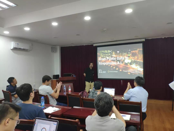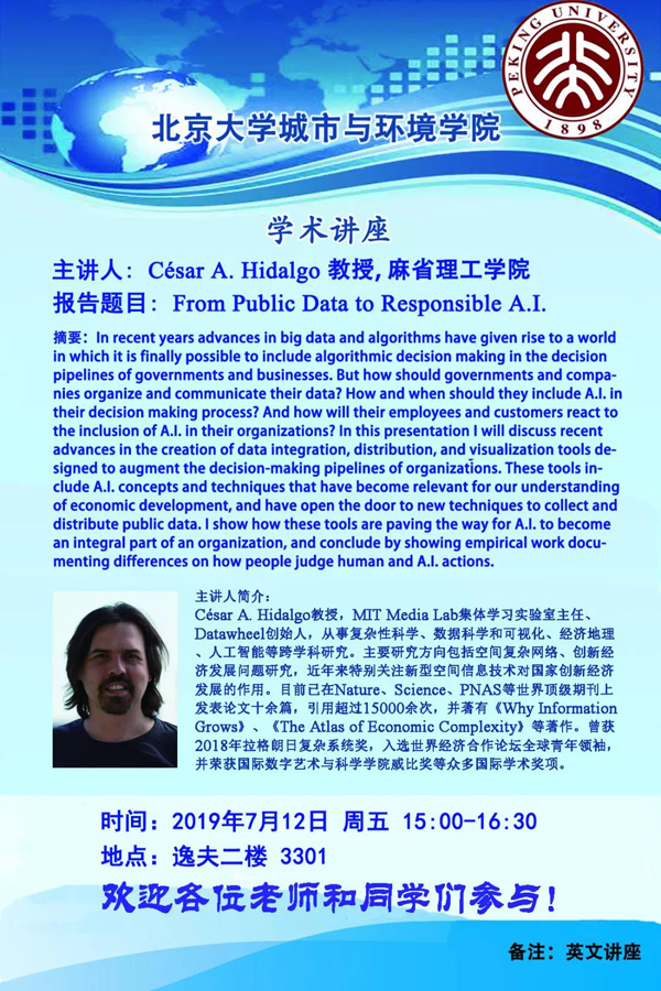 报告题目:From Public Data to Responsible A.I. 在第二个报告中,Hidalgo教授回顾了他过去15年以来的研究工作。他的报告涉及四个方面:首先,如何通过机器学习以及AI来获取和匹配公开数据;其次,如何利用公共数据的数据分发系统为公众提供所需数据,Hidalgo教授同时展示了其信息挖掘开源工具研发团队自2011年至今的的应用成果;第三部分介绍了他对于经济复杂度和相关性的研究;最后,通过展示公众调查结果,探讨AI伦理问题,了解人们是如何看待人工智能的。 Hidalgo首先指出,公共和私人组织为了决策需要处理和分析多种大量数据,但是合并、匹配、可视化以及分析数据流的过程是非常昂贵的。机器学习和AI技术能够降低获取公共数据的成本,但其应用需面临四个方面的挑战。Hidalgo对如何解决数据整合的挑战、分配的挑战、分析的挑战和自动化的挑战进行了一一介绍。 随后,Hidalgo展示了其团队从2011年至2018年所开发的各种数据工具平台,包括Data viva, Data USA, Data Africa, Data Chile, Data Korea等,并展示了数据使用情况的变化。 在第三部分中,Hidalgo重点介绍了其关于经济复杂度和相关性的研究,包括:2007年Hidalgo等人发表在Science上关于相关性的研究;2009年Hidalgo和Hausmann在PNAS上发表的对于经济复杂度的研究及测度;2014年MIT出版社出版的相关研究书籍;2018年Hidalgo等人在第九届国际复杂系统会议上的相关性原理的研究;2018年Jara-Figueroa等人和Hidalgo对于产业、职业、位置及特殊知识对于初创公司生存影响的研究;2018年Alshamisi、Pinheiro和Hidalgo在Nature Communication上发表的关于相关产品最佳多样化战略的研究;以及Neffke、Henning、Boschma等人对产业空间的相关性研究等等。 最后,Hidalgo介绍了机器学习及深度学习的大量应用案例及其贡献,例如识别地点变化、辅助决策医院的新建、更新和选址等。此外,Hidalgo还重点介绍了他将于2020年发表的对于AI伦理问题的最新研究成果,讨论了人们对于人/机器人做同样一件事的不同态度。 报告后,现场听众与Hidalgo进行了热烈的互动提问。 两场汇报结束后,Hidalgo和Balland还与部分听众学生合影留念。 嘉宾简介 César A. Hidalgo教授,MIT集体学习实验室主任、Datawheel创始人,从事复杂性科学、数据科学和可视化、经济地理、人工智能等跨学科研究。主要研究方向包括空间复杂网络、创新经济发展问题研究,近年来特别关注新型空间信息技术对国家创新经济发展的作用。在经济地理领域的主要贡献是创建了路径依赖性及经济复杂性指标。目前已在Nature、Science、PNAS等世界顶级期刊上发表论文十余篇,引用超过15000余次,并著有《Why Information Grows》、《The Atlas of Economic Complexity》等著作。曾获2018年拉格朗日复杂系统奖,入选世界经济合作论坛全球青年领袖,并荣获国际数字艺术与科学3p视频