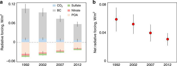 团队自己建立的全球高分辨大气污染物排放清单,基于最新调查获得农村居民生活能源结构和消耗量数据,研究组系统评估了中国农村生活能源转型带来的环境、健康和气候效应。研究发现,从1992年到2012年的20年间,由于家庭生活能源的清洁转型,农村生活源燃烧排放对大气PM2.5的贡献和人群呼吸暴露浓度的贡献显著地下降。在校正了人口增长、老龄化、自然死亡率变化等因素后,这二十年间因农村生活能源转型使得大气PM2.5暴露导致的过早死亡人数净减少13万。相应地,农村生活源排放的CO2和PM2.5等引起的辐射强迫从1992年的0.057±0.016 W/m2下降至2012年的0.031±0.008 W/m2。生活能源对大气污染、健康危害和气候变化的影响具有很大的时空差异。在北方地区和冬季,受取暖需求等影响,生活能源排放的贡献相对较大。该研究为全面而客观地认识生活能源对大气环境与健康的影响提供了重要的价值。以沈国锋为第一作者,陶澍为通讯作者的研究论文(impacts of air pollutants from rural Chinese households under the rapid residential energy transition)发表在近期《自然∙通讯》(Nature Communication)上。(//www.nature.com/articles/s41467-019-11453-w) 图1. 1992-2012年间农村生活源排放造成的PM2.5暴露引发的过早死亡人数 图2.1992-2012年间农村生活源排放的CO2和主要颗粒态污染物造成的辐射强迫