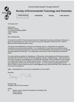 陶氏化学可持续发展创新大赛提名奖。 2005年,指导学生万祎获首届全国奥加诺水质与水环境奖学金一等奖 2008年,指导学生万祎获北京市优秀博士论文奖; 2009年,指导学生常红获北京市优秀博士论文奖; 2009年,指导学生万祎获国家优秀博士论文提名奖; 2011年,指导学生彭辉、孟丽苹、范湛蓝、吴世闽获第三届3p视频