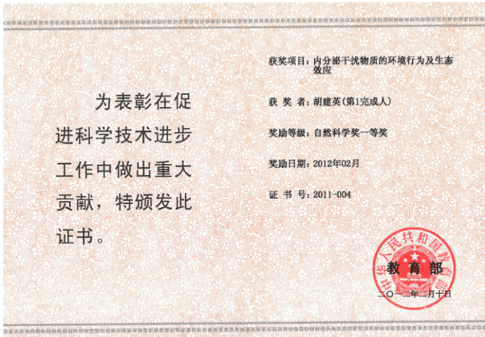 的教学评估中成绩位列第一。 在本科生当中开设“微量有毒物风险分析”,由于国内没有很好的教材,胡老师将自己历年的课程教案和相关研究工作进行整理,编写了一本教材《化学物质的风险评价》 研究生课程开设 “环境污染化学”课程,是环境科学专业研究生的必修课,这门课以实际研究工作为主线,结合一些相关知识,信息量很大,而且每年都有新鲜的内容,经常刺激大家思考,深受研究生们的喜爱。