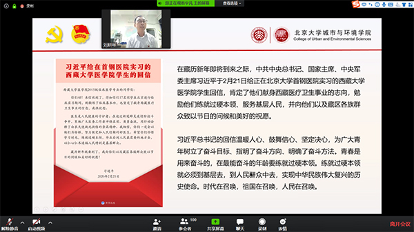 党支书、团学研骨干、第34期党性教育读书班成员、团支书培训“领雁”计划学员及“城帜”团校学员共161人参与活动。活动由王宇凡主持。 活动开始前,与会师生跟随2019级本科1班团支部制作的《同“心”战“疫”》视频一起为湖北和中国加油。刘耕年带来一堂别开生面的党课。他结合2月23日习近平总书记在统筹推进新冠肺炎疫情防控和经济社会发展工作部署会议上的讲话讲解了当前防疫形势和党的领导下统筹推进疫情防控和经济社会发展工作的重要举措,介绍了近期北大人在疫情防控中的工作情况和3p视频