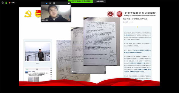 2018届毕业生、湖北选调生上官淮亮对基层抗击疫情工作进行了介绍。战“疫”打响后,上官淮亮在湖北宜昌市远安县洋坪镇全面参与疫情防控一线工作,扎实做好返乡人员排查、道路交通管控和应急运输保障,严格做到守土有责,守土担责,守土尽责。他介绍了一线医务人员、人民警察及基层工作者的工作状况及他们身上的信仰、党性、担当,表示共同战“疫”需要每个人坚守岗位、同心协力。他将带着母校的关怀与期待,发挥北大人担当作为、干事创业的奋斗精神,早日和同志们一起打赢这场疫情防控人民战争。 上官淮亮介绍湖北基层战“疫”工作情况 与会人员集体学习了回信内容,深受鼓舞,倍感振奋,纷纷表达了对习近平总书记回信的激动之情,部分同学结合近期的防疫工作分享了学习感悟。刚刚通过团支部推优成为入党积极分子的2018级本科生张天硕结合祖辈到新疆修铁路、母亲参加战“疫”一线工作的经历,分享了自己对总书记回信的理解。一代人有一代人的长征,他立志用自己的规划专业知识造福人民,特别是基层群众。 张天硕分享学习总书记回信感悟 3p视频