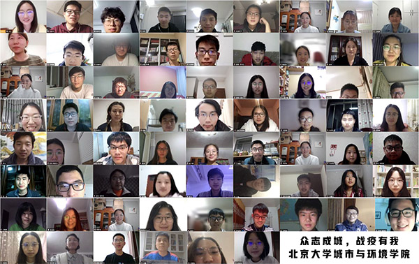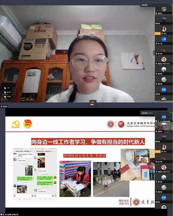 防疫工作学生专员,他认为,国之召唤,使命必达,用青春小我奉献国之大家,是新时代青年人的责任和承诺。 两位湖北同学各自介绍了家人在战疫一线工作的事迹。国庆70周年群众游行方阵队员、2018级本科城规班团支部余犀雨的母亲是襄阳市第一人民医院病理科主任医师,她和同事争分夺秒地对新冠肺炎患者的组织进行采样,取材、固定、包埋、切片、染色、显微镜观察。这次疫情让余犀雨看到了医护工作者的无私与伟大。同时他也回忆起参加国庆70周年群众游行训练中身边的青年党员、团员冲锋在前的担当,他表示,青年人要向这些优秀榜样学习,时刻准备好为人民挺身而出、勇往直前。2019级硕士党支部的李君怡用“感动、辛苦、焦虑、欣慰”四个关键词讲述了身在武汉的一家人参与社区一线防疫工作的感人事迹:为邻里间互助互爱、令人感动而感动;为道路难走、早出晚归而辛苦;为无证人员不听劝阻、担心自己感染病毒并进行传染而焦虑;为守职期间群众们的支持和感激而欣慰。通过这次疫情,她也更深切地体会到青年学子的本职和担当。李君怡发言后,与会所有师生集体鼓掌向武汉人民致敬,为武汉人民加油。 图5 李君怡介绍家人在武汉社区防疫一线工作情况会议 最后,3p视频