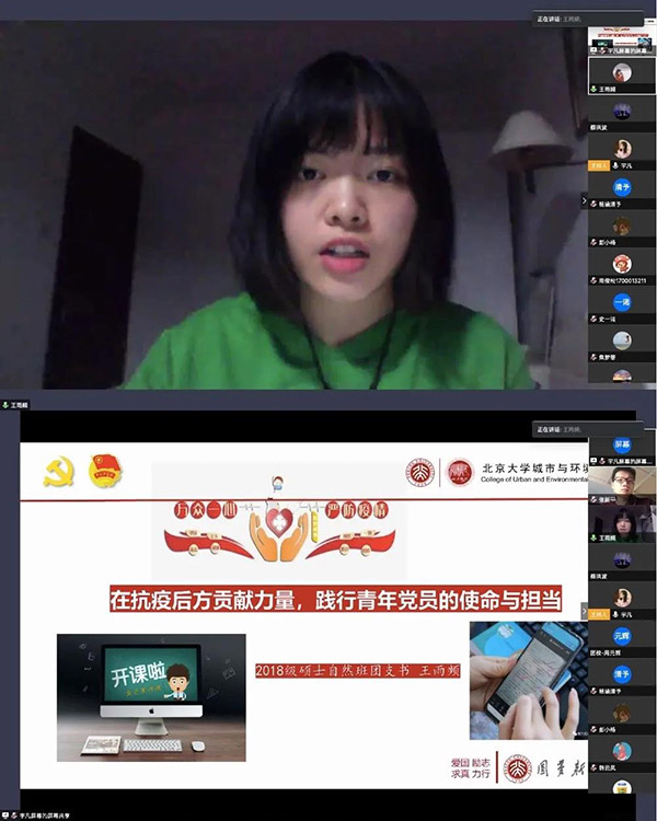 、以及所在地政府部门的管理,不因自己的固执和私欲破坏全国的抗疫大局,体现在居家期间继续做好学习和科研任务,努力做到认识不掉队、能力不滑坡。而在未来,我们应该成为祖国发展建设伟大事业中的一块砖、一颗螺丝钉,时刻准备着,去需要我们的地方,去充分发挥我们的才能,发光发热,进而实现我们的人生价值。 两位湖北同学各自介绍了家人在战疫一线工作的事迹。国庆70周年群众游行方阵队员、2018级本科城规班团支部余犀雨的母亲是襄阳市第一人民医院病理科主任医师,她和同事争分夺秒地对新冠肺炎患者的组织进行采样,取材、固定、包埋、切片、染色、显微镜观察。这次疫情让余犀雨看到了医护工作者的无私与伟大。同时他也回忆起参加国庆70周年群众游行训练中身边的青年党员、团员冲锋在前的担当,他表示,青年人要向这些优秀榜样学习,时刻准备好为人民挺身而出、勇往直前。2019级硕士党支部的李君怡用“感动、辛苦、焦虑、欣慰”四个关键词讲述了身在武汉的一家人参与社区一线防疫工作的感人事迹:为邻里间互助互爱、令人感动而感动;为道路难走、早出晚归而辛苦;为无证人员不听劝阻、担心自己感染病毒并进行传染而焦虑;为守职期间群众们的支持和感激而欣慰。通过这次疫情,她也更深切地体会到青年学子的本职和担当。李君怡发言后,与会所有师生集体鼓掌向武汉人民致敬,为武汉人民加油。 余犀雨发言节选:还有我许多正在学医的亲属们,他们都没有因为这次疫情的严峻和医生在这次疫情中表现出的辛苦而放弃学医这条道路。可以说,这次疫情让我认识到了我的家人最真实的一面,也让我认识到了全中国无数医疗服务者的最真实一面:他们放弃休假全力投入战疫工作,为治病救人奔赴在生死线的边缘。这样一群值得敬佩的人就在我们每一个人的身边。总书记的话激励我们向这些优秀榜样学习,时刻准备好为人民挺身而出、勇往直前。 李君怡发言节选:武汉的抗疫成果是无数人用夜以继日的无私奉献换来的,这一点,我们不会忘记。都说,没有一个冬天不可逾越,没有一个春天不会到来,但是很多人永远地留在2020年的冬天。也许只有我们齐心协力去创造一个更繁荣、更文明的未来,才足以告慰那些逝去的亡灵和英雄。 会议最后,3p视频
