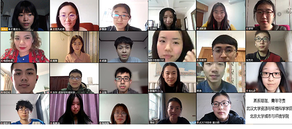 2018级硕士自然班团支书王雨频主持。 图1 部分参会人员合影 活动开始前,与会师生一同观看了新华社抗“疫”纪录片《英雄之城》。王雨频首先介绍了参加共建学习活动的两校支部的基本情况,参会师生分别进行了自我介绍,传递了在五湖四海的真挚祝福,大家通过会议平台“云”赏春,共同饱览了燕园和珞珈的美丽春色。接着,双方支部同学共同学习总书记给3p视频