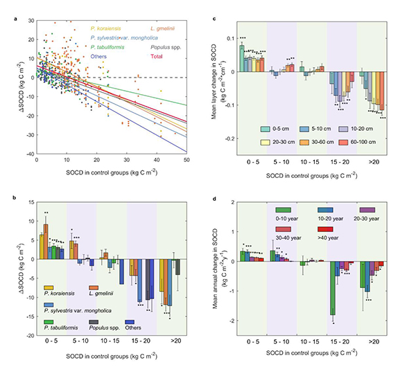 2018级博士生洪松柏,2015届博士毕业生、现北京师范大学博士后殷国栋为论文共同第一作者。朴世龙教授和陈安平博士为论文共同通讯作者,曾辉教授为共同作者。 论文链接://www.nature.com/articles/s41893-020-0557-y. 图1. 影响植树造林之后土壤有机碳动态的因素 a. 土壤有机碳变化量与本底值的关系;b. 不同树种的影响;c. 不同深度的土壤有机碳变化;d. 土壤有机碳变化量的时间动态