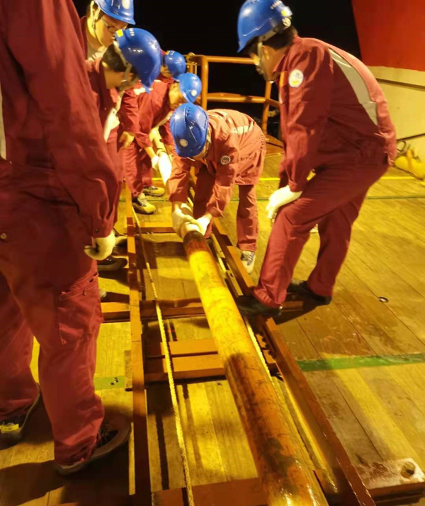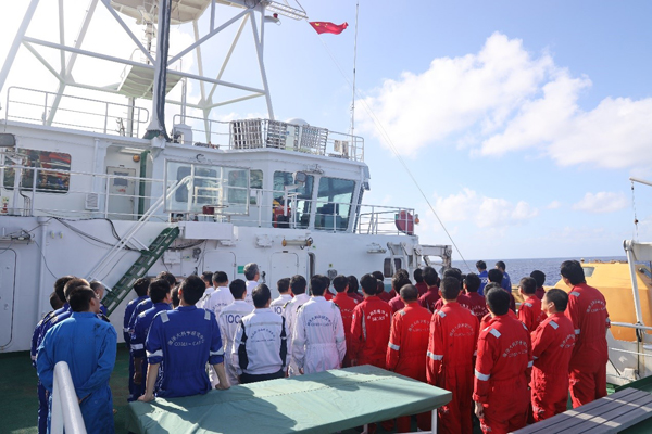 北京时间2021年1月1日上午8点,国家自然基金重大项目“西北太平洋地球多圈层相互作用”NORC-581航次的全体研究人员和船员们在登艇甲板上举行了一次特别的升旗仪式。伴着国歌,国旗徐徐升起,迎风飘扬,大家行着注目礼,内心的庄严感与使命感油然而生,航行在西太平洋上,我们仍与祖国连在一起!中共十八大报告提出,提高海洋资源开发能力,发展海洋经济,保护海洋生态环境,坚决维护国家海洋权益,建设海洋强国,这是中国特色社会主义事业的重要组成部分。我们要提高海洋科技自主创新能力,跟踪和探索海洋领域的重大科学问题,提高勘探开发海洋资源的水平,加快建设海洋强国。而如今,我们也希望能够通过自己的从事的海洋相关研究为我国海洋强国的建设贡献一份力量。 图1 元旦升旗仪式 在马里亚纳海沟连续作业20天后,本航次的科研任务已完成大半,“科学”号开始向北返航。但参与航次的四位同学(3p视频