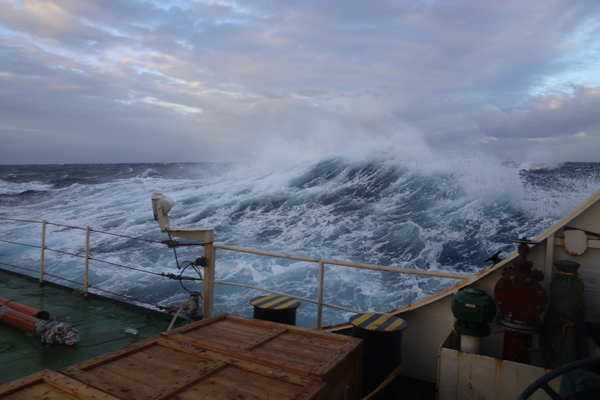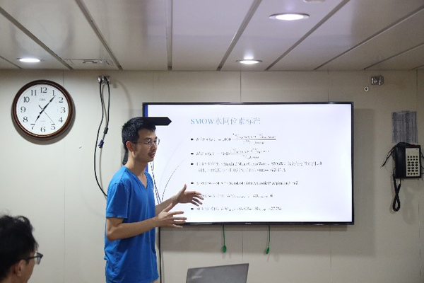 周力平教授研究小组的第四纪地质博士研究生安永睿、梁雍祺、商纪元和硕士研究生张婉莹)想到接下来的任务,内心却并不轻松。CTD采水作业仍在进行,除马里亚纳海沟外,在菲律宾海不同海盆、地形处也布设了站位,以期能够解密这片海区多个界面的地球化学、物理海洋和沉积地质过程及相互作用。同时还将进行首次重力柱沉积物采样。由于正值北半球冬季,受冬季风影响的西太平洋中纬度海区海况恶劣,加上寒冷的气温,给船上作业带来了未知与挑战。 尽管天气多变,在航行期间大家每天仍保持着固定的时间间隔风雨无阻地采集表层水和大气样品,每天清早和傍晚,安永睿都会站在侧甲板,用一个连着尼龙绳的小不锈钢桶“打水”,这种看似原始简单的方法其实也需要一些技巧和经验,既要让海水对桶充分润洗,又要避免小桶被翻涌的海浪卷走。为避免船舶尾气污染干扰,采集大气样品需爬上顶层的雷达塔,驾驶室的船员们知道后,每次采样都为我们提前关掉雷达,遇到夜间采样便会在塔下打开手电筒,默默地关注着我们的一举一动。 图2 安永睿进行大气采样工作 采样作业并不总是顺利的。第一次沉积物重力柱采样时,由于站位选在帕利希维拉海盆中部断裂东侧,洋底火山碎屑较多,底泥过硬,重力柱仅下插到1.5m左右的深度且发生倾倒,在上提和回收过程中样品受到冲刷,柱状样品未能带回,仅留下外壁剐蹭的极少量泥样。后甲板上明媚的阳光的远处的彩虹相映成趣,却与我们沉积物重力柱作业失败的尴尬境地形成巨大反差。 图3 后甲板沉积物重力柱采集回收作业现场 尽管由于天气、海底地质条件等不可控性因素导致的意外状况时有发生,但好在首席张国良研究员和工程技术部的几位技术员们都在第一时间从各自的专业角度给出了解决的建议,而船上的Wi-Fi也保证了四位同学能够及时与陆地上的老师、同学们进行交流。还记得第一次重力柱取样失败后,周老师在微信语音中鼓励大家:“失败是成功之母。”关于下一次沉积物采样位置、样品处理和保存等问题的讨论也使大家对下一次的采样工作重新有了信心,最终顺利回收了长达5.37m的沉积物柱状样品。 图4 周老师与海上课题组的同学们连线讨论 除了突发情况的讨论,安永睿每天都与课题组保持微信联系并汇报当日工作,周老师对我们在船上的日常生活和采样工作保持时刻关注,并提醒我们及时处理、整理相关采样数据并备份,合理安排好时间,保持思考以及保持交流讨论。 读书之人不慕名利,更重“神交”,“科学”号在“作站”之余也给了我们不少“神交”的机会,小组内讨论技术细节,组间交流科学问题,也是一大幸事。船上有不少好书,也有不少好书之人,阅读之中,心领神会,从《深海浅说》到《人类简史》,心意相通,好不乐哉!除了这些日常的交流,“科学”号在站间空隙插出的学术报告更是充满着思想的火花。学术报告由首席张国良研究员打头,开篇洋洋洒洒两个小时,从星际空间一直讲到板块深部的碳循环,给我们后面的报告人做了示范却也给了不少的压力。梁雍祺和安永睿在站间航渡分别做了报告,其一是安永睿的“稳定水同位素原理与其海洋学应用”,其二为梁雍祺的“放射性碳同位素示踪大洋环流”。 稳定水同位素意即水中的稳定氢同位素和稳定氧同位素,一般指2H和18O分别对1H和16O的相对含量。水同位素在海洋学领域最重要的应用之一在于它可以进行溶剂层面的示踪,直接反映水的相变和水团之间的混合交换过程。船上的报告,交流为主,首席的提问可毫不含糊,几个重要海峡的开闭对于水同位素分布的影响,异地源区降水对表层海水稳定水同位素分布的作用,如此种种让我们得到了不少新的思路,也学到了不少地质学家考虑问题的角度。 图5 安永睿在“科学”号上做学术报告 梁雍祺的放射性碳同位素一般指14C,也即是测量14C对于12C的相对含量,前面提到首席的报告里可就有地球深部的碳循环,对于梁雍祺的报告自然是有更多的话想说,首席对海底自生碳酸盐岩的形成特别感兴趣,首席助理张吉和我们交流了海底地形对环流的影响,而这一问题恰好也是我们此行的主要目的之一。船长、队长、船员、工程师们和各位老师同学也都从各自的角度发出了独特的声音。 图6 梁雍祺在“科学”号上做学术报告 在完成本航段所有目标作业之后,“科学”号开始乘风破浪、加足马力奔向祖国的方向。随着一路向北航线,海况也越发恶劣,翻滚的海浪甚至能打到五楼甲板,不禁使我们想起了航程伊始一系列安全培训时的应急操作,不过看到船长和船员们镇定自若的样子,大家的心也逐渐安定下来。如同刚启程的几天,船上的大部分人员又出现了不同程度的晕船症状,正如那句顺口溜:“一言不发,二目无神,三餐不进,四肢无力,五脏六腑,七上八下,久久不停,十分难受”。室内室外、躺着坐着站着蹲着倚着趴着……没有一处得以缓解,胃里翻江倒海,头晕天旋地转,整个人都处于漂浮状态,好在大家相互鼓励照顾,再加上有了经验,不至于像出发时一般“狼狈”。 图7 返程时“科学”号在西太平洋在巨浪中前行 1月11日中午,终于可以站在前甲板上远远眺望远方若隐若现的青岛天际线,越来越近。我们在青岛大港停靠,至此在西太平洋上漂泊行驶了50天的“科学”号考察船完成了科学考察采样任务,行驶了28644海里后