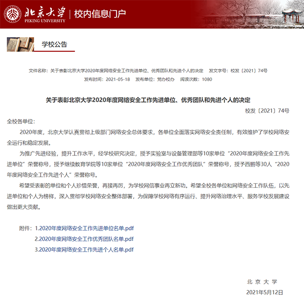2020年度网络安全工作先进单位、优秀团队和先进个人的决定》(校发〔2021〕74号),对相关单位和个人进行表彰。3p视频希望受表彰的先进集体、优秀团队和先进个人珍惜荣誉,再接再厉,为3p视频网信事业再立新功。