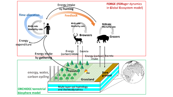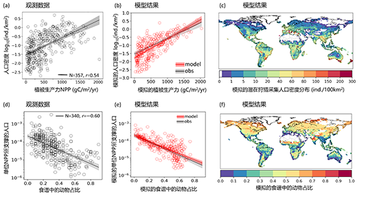 朱丹研究团队在已有的陆面过程模式基础上,构建了首个全球植被-动物-人类(狩猎采集者)相耦合的模型(图1):该模型在物质能量守恒基础上,通过描述人类每天根据动植物资源的相对丰度选择捕猎或采集来获取食物等微观过程,结合出生和死亡(营养状态影响出生率和死亡率)等人口学方程,来模拟不同气候和生态系统中的人口动态。 图1. 基于ORCHIDEE陆面过程模式构建的全球植被-动物-人类(狩猎采集者)相耦合的模型 这一基于过程(process-based)的机理模型涌现出重要的规律:在非生长季(冬季或旱季)较长的地区,由于可食用植物的季节性匮乏,狩猎采集者高度依赖由捕猎获取的动物作为食物来源;同时由于能量从低营养级向高营养级传递会产生大量损耗,对于食谱中动物占比更高的族群,单位NPP所能支撑的人口密度远低于以植物为主要食物来源的族群。该机理模型涌现出的宏观规律得到了观测数据的支持(图2),进而从机制上定量揭示了世界各地狩猎采集人口密度巨大差异的原因。 图2. 生态系统-人类耦合模型揭示出:食谱中肉食占比(由动植物资源的季节性相对丰度决定)的增加显著降低单位NPP所能支撑的人口密度 接下来,研究团队计划将该模型应用于过去近二十万年,探究古气候变化和生态系统演变如何影响古人类的人口动态和迁徙,以及人类觅食、捕猎和扩张如何反作用于生态系统,从而更深入理解人类演化和发展的自然影响因素以及史前人类对生态系统的长期影响。 该研究成果以“Global hunter-gatherer population densities constrained by influence of seasonality on diet composition”为题,于2021年9月9日在线发表于Nature Ecology & Evolution(《自然•生态与演化》)。3p视频