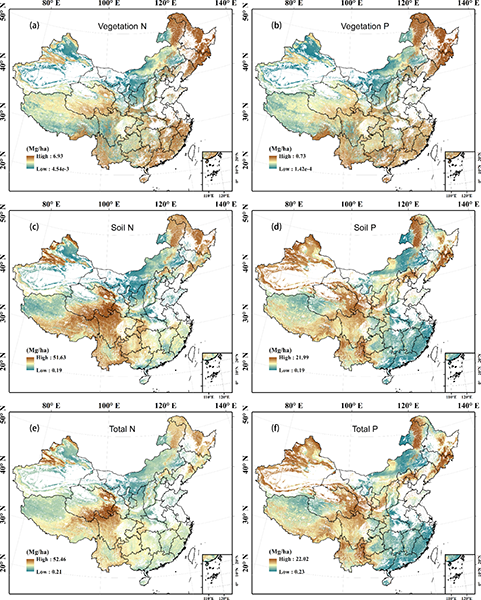 战略先导专项项目的支持。相应的中国陆地自然生态系统氮、磷密度和含量的空间数据同时存储于Dryad数字化资源库供下载(//doi.org/10.5061/dryad.6hdr7sqzx)。 图1 中国陆地生态系统氮、磷密度的空间分布格局图 唐志尧课题组近年来在中国植物化学计量特征的分布格局、养分的器官分配及其与生态系统生产力之间的联系等方面开展了系统性工作,系列研究成果发表于PNAS, ESSD, Journal of Ecology, Plant and Soil, Biogeosciences等国际著名刊物。 主要相关论文 Tang ZY et al. 2018. Patterns of plant carbon, nitrogen, and phosphorus concentration in relation to productivity in China’s terrestrial ecosystems. PNAS 115: 4033-4038. Zhang Y-W, Guo YP, Tang ZY* et al. 2021. Patterns of nitrogen and phosphorus pools in terrestrial ecosystems in China. Earth System Science Data 13, 5337–5351. Guo YP, …, Tang ZY*, 2020. The community‐level scaling relationship between leaf nitrogen and phosphorus changes with plant growth, climate and nutrient limitation. Journal of Ecology 108: 1276–1286. Guo YP, …, Tang ZY*. 2020. Climate and vegetation together control the vertical distribution of soil carbon, nitrogen and phosphorus in shrublands in China. Plant and Soil 456: 15-26. Yang X, …, Tang ZY*. 2016. Variations of leaf N, P concentrations in shrubland biomes across Northern China: phylogeny, climate and soil. Biogeoscience 13: 4429-4438. Guo YP, …, Tang ZY*. 2017. Legume shrubs are more nitrogen-homeostatic than non-legume shrubs. Frontiers in Plant Sciences 8: 1662. Yang X, Tang ZY*, et al. 2014. Scaling of nitrogen and phosphorus across plant organs in shrubland biomes across Northern China. Scientific Reports 4: 5448. Guo YP, ..., Tang ZY*. 2021. Environmental constraints on the inter-genus variation in the scaling relationship between leaf nitrogen and phosphorus concentrations. Journal of Plant Ecology 14: 616-627.