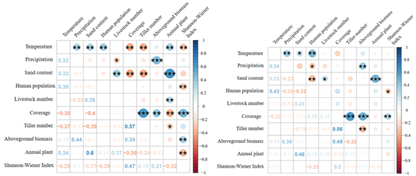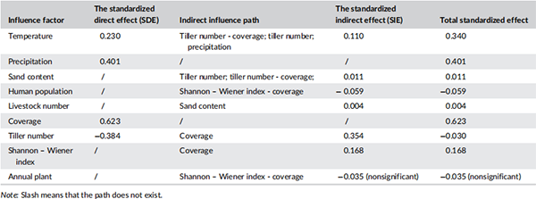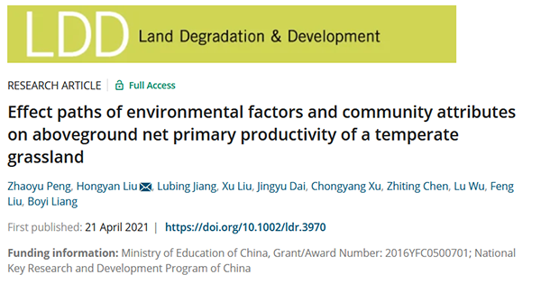 2016级生态学专业本科生彭昭宇同学以第一作者在《Land Degradation & Development》发表拔尖计划研究成果文章“Effect paths of environmental factors and community attributes on aboveground net primary productivity of a temperate grassland”。 草地地上净初级生产力(ANPP)可直接反映草地生长状况和评价草地生态系统服务功能,同时也是草地退化的敏感指标,其受环境因子和植物群落属性的共同影响。然而,以往的研究主要集中在环境因子和植物群落属性对ANPP的单独影响上,环境因子和植物群落属性对ANPP的影响路径难以量化。本研究以中国北方农牧交错带温带草原为研究区,通过分层取样的方法,采用结构方程模型,定量分析了环境因子和植物群落属性对草地ANPP的影响路径。 图1 中国北方农牧交错带及采样点概况(主图绿点为采样点位置,次图显示了中国北方农牧交错带的位置和交错带内的植被类型) 图2 ANPP与气候因子和植物群落属性相关性 研究表明,环境因子可通过群落属性间接影响ANPP,植物群落属性在环境因子影响ANPP的过程中起着重要作用。生长季降水是影响草地ANPP的最关键因素,其对ANPP的直接影响(标准化直接效应SDE = 0.401, p<0.05)是主要路径。温度升高一方面直接促进ANPP (SDE = 0.230, p<0.05),另一方面通过调节地上分蘖数间接影响ANPP (标准化间接效应SIE = 0.110)。与气候条件相比,土壤质地、载畜量和人口数量对草地ANPP的影响较小(SIE = 0.011,-0.059和0.004),土壤含沙量的增加降低了分蘖数进一步影响了ANPP (SIE = 0.011, p<0.05)。人口数量通过改变物种多样性影响ANPP (SIE = -0.059, p<0.05),载畜量的增加通过使土壤粗化降低ANPP。 表1 SEM结果中各影响因子对ANPP的标准化直接效应和间接效应及总标准化效应 本研究以中国北方温带草原为研究对象,定量分析了环境因子和植物群落属性对草地ANPP的直接和间接影响。研究结果表明,在区域尺度上,降水等气候因子对ANPP的贡献率是土壤质地和人类活动的10-40倍,因此,区域尺度上气候变化对草地生产力提升的限制作用值得关注。此外,提高物种多样性和增加植被覆盖度是快速提高草地生产力的有效措施,将有效缓解气候变化对退化草地的负面影响。 3p视频