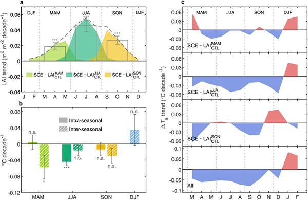 博士研究生连旭(已获学位)为第一作者,朴世龙院士和韩国首尔大学Sujong Jeong教授为共同通讯作者。 论文链接://www.nature.com/articles/s41467-022-31671-z 图1. 北半球各生长季节植被变化所产生的当季和跨季气温效应。
