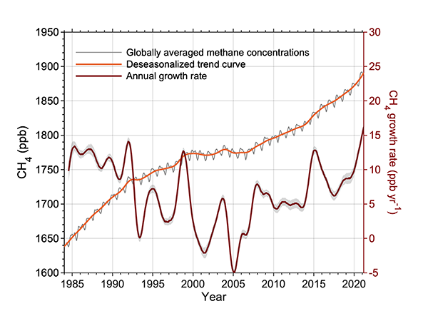 甲烷是一种重要的温室气体。自工业革命以来,大气甲烷浓度增加了2倍,在所有温室气体的辐射强迫中占比三分之一。要实现《巴黎协定》的温室气体减排目标,将全球温升控制在2 °C以内,削减人为甲烷排放降低大气甲烷浓度迫在眉睫。近十五年大气甲烷浓度呈现增长加速的趋势,2020年甚至达到了1984年以来有站点观测记录的最大值。如果未来大气甲烷浓度持续加速增长,将会对减排和巴黎协定温控目标的实现带来严峻挑战。因此,亟需回答大气甲烷浓度为什么近期增长加速这一国际难题。 大气甲烷浓度增速主要受人为源排放、自然源排放和大气汇共同控制,然而由于这三部分估算的不确定仍难以对大气甲烷浓度增速进行归因,尤其是大气汇的贡献最具挑战。2020年由于新冠疫情的蔓延及各国防疫措施的实施,人为甲烷排放有所降低,但大气甲烷浓度却反而飙升,提供了控制人为排放研究大气甲烷浓度的完美“实验”。 图1 大气甲烷浓度观测曲线。灰色为观测值,橙色为趋势线,棕色为增速 面对上述挑战和机遇,3p视频