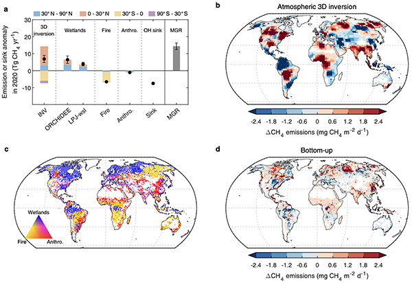 彭书时研究团队与多所国内外研究机构合作,基于大气甲烷浓度观测、能源和农业清查数据、气象和遥感等多源数据,利用湿地过程模型、大气化学传输模型和大气反演模型,结合“自下而上”和“自上而下”的温室气体源汇评估方法,探究了2020年大气甲烷浓度飙升之谜。 研究发现,相比于2019年,2020年人为甲烷排放减少了1.2百万吨,火灾甲烷排放减少了6.5百万吨。2020年更暖更湿的气候使得湿地甲烷排放增加了2.5 – 9.4百万吨,主要源自高纬度湿地和北半球热带湿地。然而,湿地排放增加量的最大值(9.4 百万吨)仍不足以解释2020年大气甲烷浓度的飙升,暗示着甲烷大气汇在2020年可能减少。 大气甲烷主要通过与大气对流层中的OH自由基反应来移除。OH自由基寿命极短,难以直接测量,是研究大气甲烷汇变化最为棘手的难题。研究发现,由于2020年新冠疫情人为排放的氮氧化物减少,由大气化学传输模型模拟得到的对流层OH自由基浓度平均减小了1.6%,这与另一种基于大气中三种氟化气体浓度反演得到的OH自由基的变化相吻合。2020年大气OH自由基浓度降低导致了大气甲烷汇减少了7.5百万吨。 研究进一步发现,由“自上而下”评估方法得出的甲烷排放变化空间格局与“自下而上”的结果相一致,佐证了自然排放增加由湿地排放增加主导。因此,2020年大气甲烷浓度增长加速一半归因于由湿地主导的自然排放增加,另一半归因于对流层OH自由基浓度的降低。 该研究为理解全球的甲烷收支提供了新见解,揭示了湿地甲烷排放对实现全球温控目标不可忽略,并认识到未来甲烷减排计划需要同时考虑氮氧化物等人为污染物排放趋势变化所导致的大气甲烷寿命变化,为《巴黎协定》的温升目标实现和全球甲烷减排承诺提供了科学依据。 图2 2020年大气甲烷浓度飙升的归因。相比于2019年,a, 2020年大气甲烷浓度增长加速的归因;b,基于“自上而下”大气反演方法估算的甲烷排放变化的空间格局;c,2020年甲烷排放变化主导源的空间格局;d,“自下而上“方法估算的甲烷排放变化的空间格局。 研究成果以“湿地排放和大气汇的变化解释了2020年大气甲烷浓度增加(Wetland emission and atmospheric sink changes explain methane growth in 2020)”为题,于2022年12月15日发表在《自然》(Nature)上,3p视频