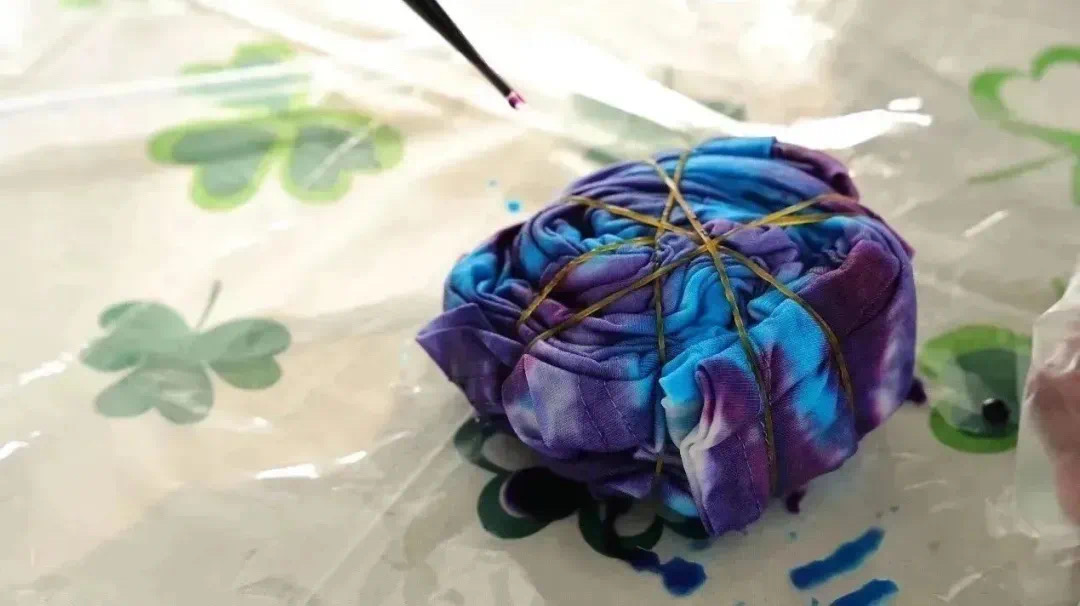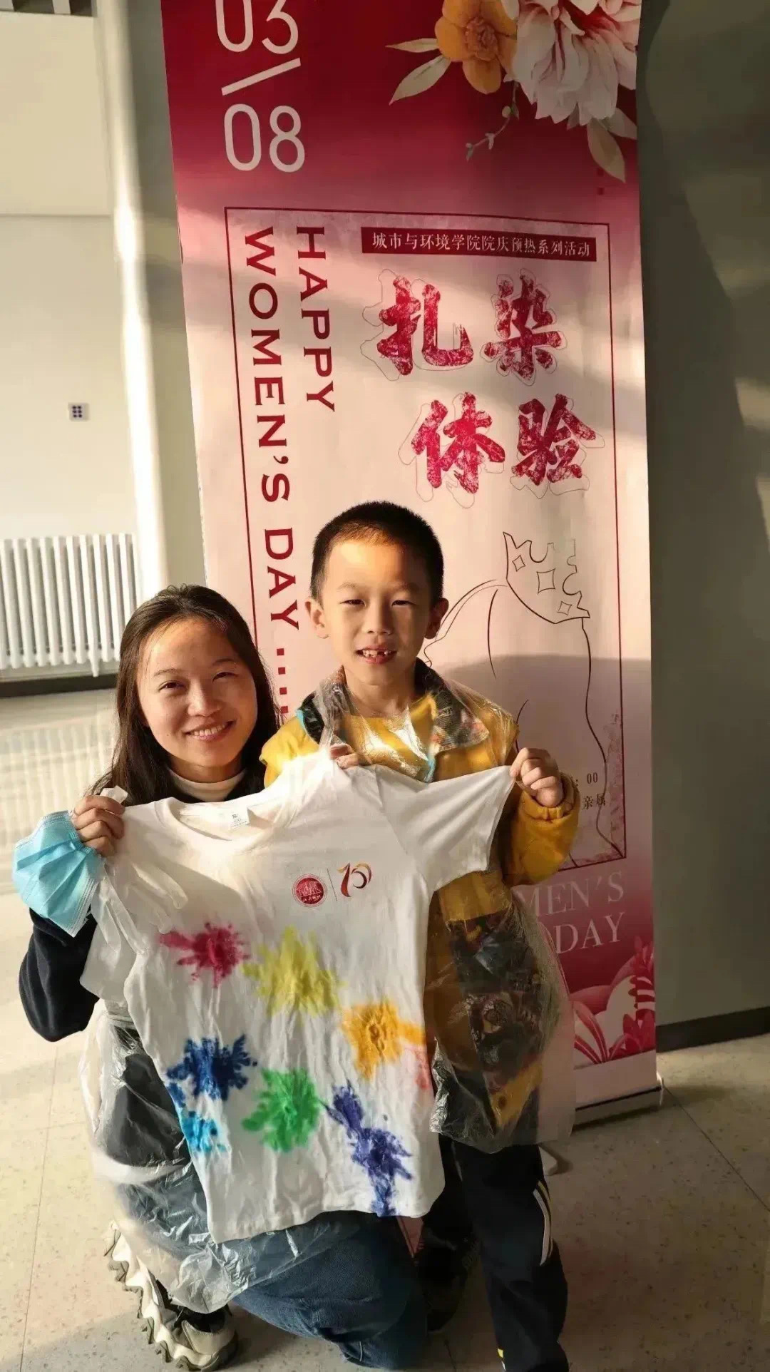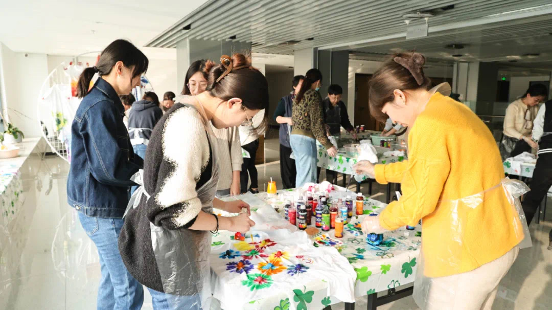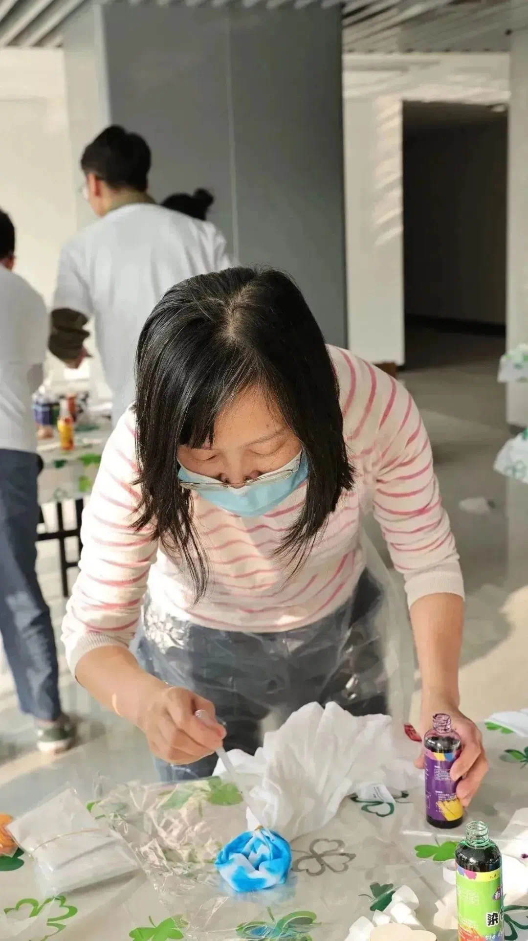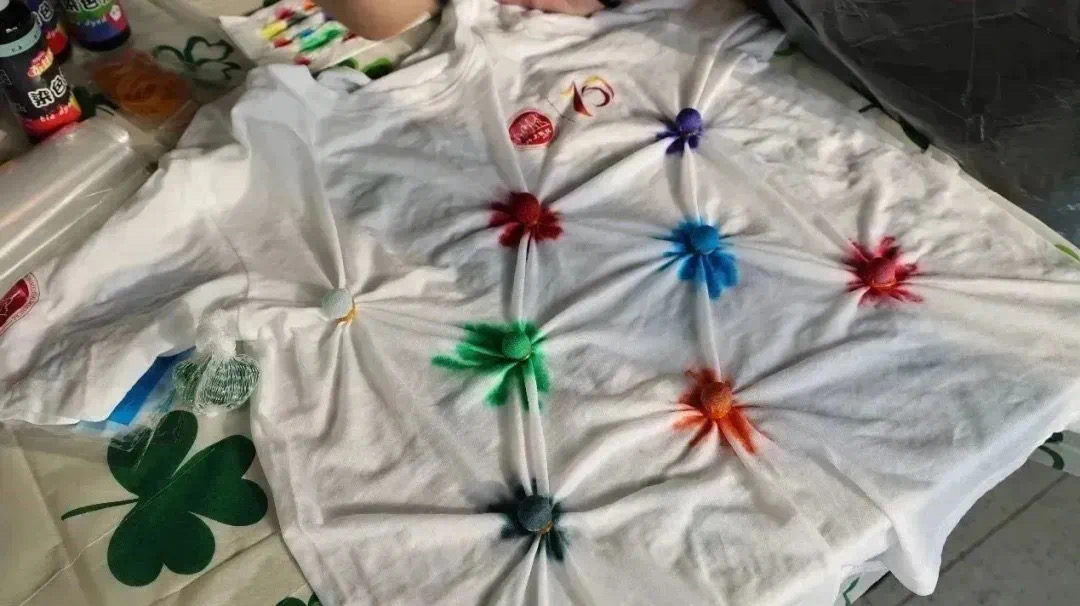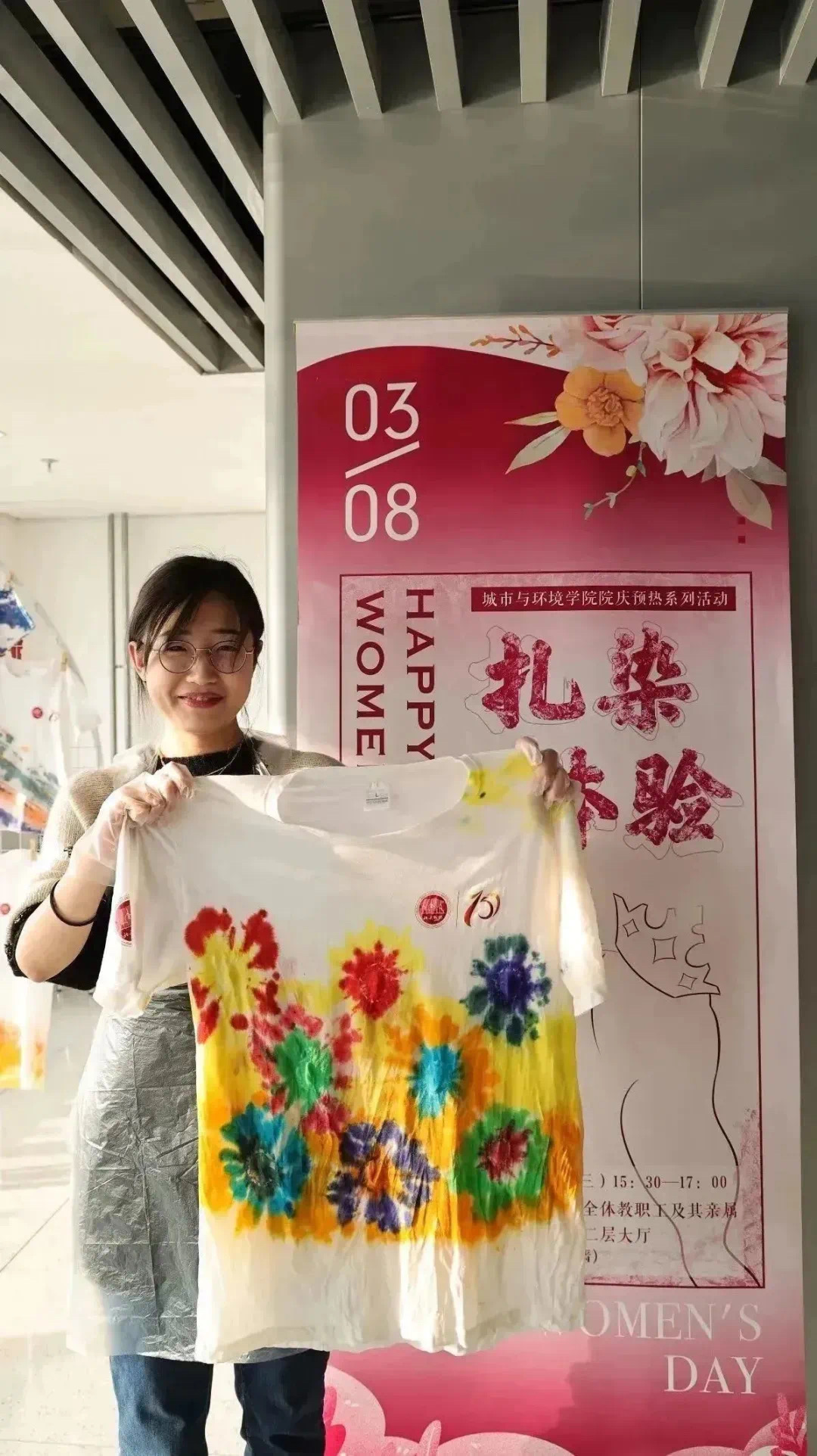 领导到场慰问 扎染是中国民间传统的染色工艺,主要分为扎结和染色两部分,通过纱、线、绳等工具,对织物进行扎、缝、缚、缀、夹等多种形式组合后进行染色。经过工作人员的简单介绍,大家迅速掌握了扎染技术的基本方法,迫不及待地投入到作品创作中。 活动现场 妙手生花,巧思尽显。用玻璃弹珠扎结花朵、用皮筋木片旋转捆绑,简单的白色T恤在大家手中被赋予了多姿造型,意想不到的惊喜正在被悄悄创造。 不同扎结方法的作品 耐心晕染、精心点缀,斑斓的色彩在大家的创意组合下呈现出无穷变化。自由豪放的泼墨、简单雅致的渐变、活泼可爱的花卉、自由奔放的火苗……或独自挥毫,或亲子联动,大家全情投入、用心创作,将艺术和美好心情融入一件件匠心独具的扎染作品中。 大家认真创作 固色濯洗,沉淀绚丽。浸泡结束后,一份份“扎染盲盒”被陆续开启。奇妙的扎结工艺让原本简单孤立的色彩渲染拓展为大片如梦如幻的斑斓,碰撞交织的花纹图案让原本无心之举的勾勒也变得如神来之笔一般。接连不断的惊喜让活动现场更加其乐融融,大家相互展示自己满意的作品,赞美之声一时不绝于耳。最后,大家纷纷与自己的作品合影留念,定格这份与扎染邂逅的美好回忆。 大家与自己的扎染作品合影留念 本次活动不仅让大家体验到扎染技艺的独特魅力,促进了教师间的交流,也弘扬了中华民族传统文化、陶冶了大家的艺术情操,使老师们在繁忙的工作中放松身心,同时收获了一份独特作品。 活动合影